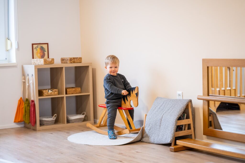 Obdobje med 2. in 3. letom je eno najbolj občutljivih obdobij v razvoju otroka. Otrok v tem času intenzivno gradi samostojnost, red, govor, motoriko, socialni stik in prvi močan občutek »jaz sam«. V skupini Malčki ustvarjamo okolje, ki podpira te razvojne potrebe z jasnimi strukturami, mirnimi prehodi in materiali, ki omogočajo samostojno delo rok, misli in telesa. Naše okolje je zasnovano po načelih pedagogike montessori: nizke police, naravni materiali, premišljena estetika in jasna razporeditev dejavnosti otroku omogočajo, da prehaja med aktivnostmi, ki ga najbolj pritegnejo. V tej starosti si otrok želi opravljati resnična opravila — prelivati, prenašati, zlagati, skrbeti za prostor, hraniti se sam, se oblačiti — zato mu nudimo priložnosti, da to počne z resničnimi materiali, v resničnem ritmu. Ker sta volja in notranja motivacija v tem obdobju izjemno močni, otrok v Malčkih dobiva strukturo, ki mu pomaga uravnavati svobodo. To je prostor resničnih izkušenj, spoštovanja in topline, kjer se otrok uči, kdo je — in kdo lahko postane.