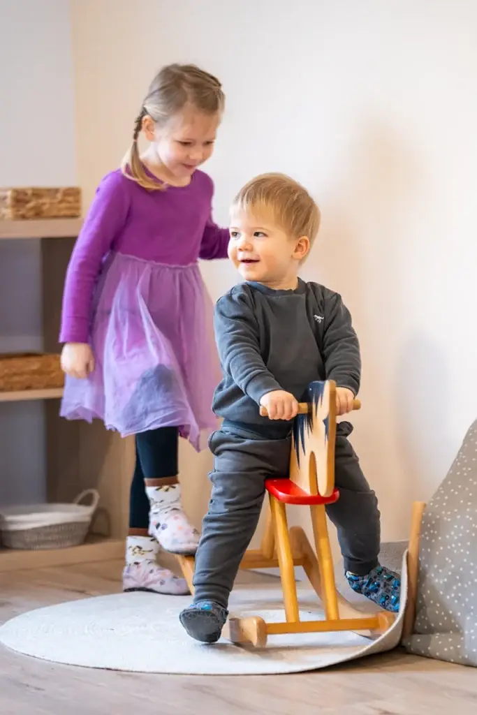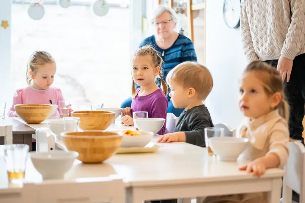 Obdobje med 2. in 3. letom je eno najbolj občutljivih obdobij v razvoju otroka. Otrok v tem času intenzivno gradi samostojnost, red, govor, motoriko, socialni stik in prvi močan občutek »jaz sam«. V skupini Malčki ustvarjamo okolje, ki podpira te razvojne potrebe z jasnimi strukturami, mirnimi prehodi in materiali, ki omogočajo samostojno delo rok, misli in telesa. Naše okolje je zasnovano po načelih pedagogike montessori: nizke police, naravni materiali, premišljena estetika in jasna razporeditev dejavnosti otroku omogočajo, da prehaja med aktivnostmi, ki ga najbolj pritegnejo. V tej starosti si otrok želi opravljati resnična opravila — prelivati, prenašati, zlagati, skrbeti za prostor, hraniti se sam, se oblačiti — zato mu nudimo priložnosti, da to počne z resničnimi materiali, v resničnem ritmu. Ker sta volja in notranja motivacija v tem obdobju izjemno močni, otrok v Malčkih dobiva strukturo, ki mu pomaga uravnavati svobodo. To je prostor resničnih izkušenj, spoštovanja in topline, kjer se otrok uči, kdo je — in kdo lahko postane.