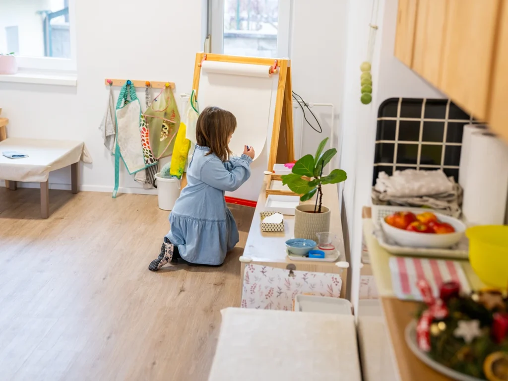 Obdobje med 2. in 3. letom je eno najbolj občutljivih obdobij v razvoju otroka. Otrok v tem času intenzivno gradi samostojnost, red, govor, motoriko, socialni stik in prvi močan občutek »jaz sam«. V skupini Malčki ustvarjamo okolje, ki podpira te razvojne potrebe z jasnimi strukturami, mirnimi prehodi in materiali, ki omogočajo samostojno delo rok, misli in telesa. Naše okolje je zasnovano po načelih pedagogike montessori: nizke police, naravni materiali, premišljena estetika in jasna razporeditev dejavnosti otroku omogočajo, da prehaja med aktivnostmi, ki ga najbolj pritegnejo. V tej starosti si otrok želi opravljati resnična opravila — prelivati, prenašati, zlagati, skrbeti za prostor, hraniti se sam, se oblačiti — zato mu nudimo priložnosti, da to počne z resničnimi materiali, v resničnem ritmu. Ker sta volja in notranja motivacija v tem obdobju izjemno močni, otrok v Malčkih dobiva strukturo, ki mu pomaga uravnavati svobodo. To je prostor resničnih izkušenj, spoštovanja in topline, kjer se otrok uči, kdo je — in kdo lahko postane.